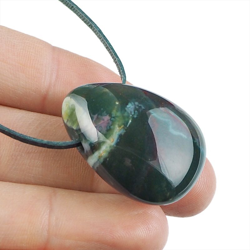 Polerowany, przewiercony agat mszysty w kształcie kropli, na rzemyku. Przybliżone wymiary kamienia: ok.: 33 x 24 x 15 mm.