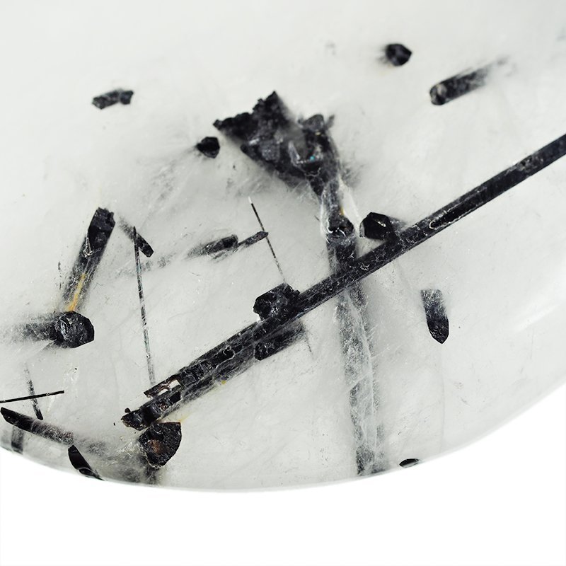 Kryształ górski z czarnym turmalinem w formie płaskiego otoczaka o długości około 48 mm. Kamień łączy w sobie przeświecający kryształ górski i inkluzje czarnego turmalinu, które tworzą interesujący kontrast.